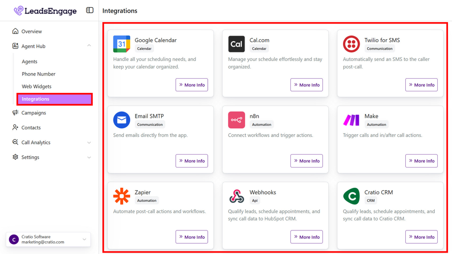 Go to Agent Hub → Integrations in your account. Choose the calendar platform you want to integrate: