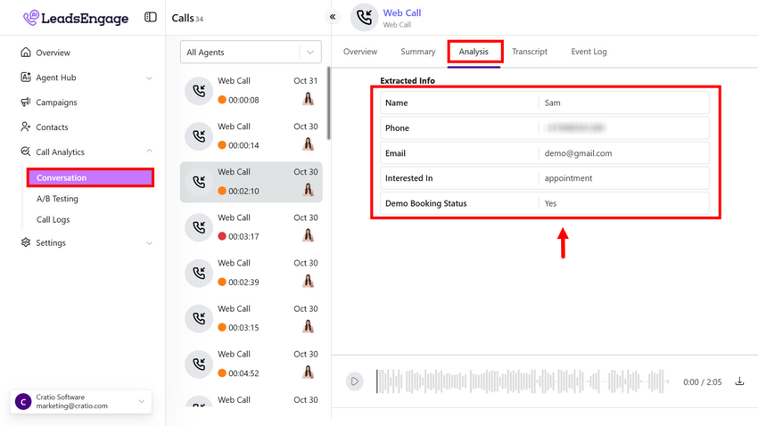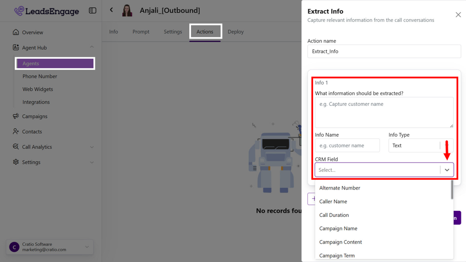 The Extract Info action allows your voice agent to capture and store key details shared by the caller during a conversation. This is useful for collecting structured data like names, contact details, booking info, or custom lead qualifications—automatically and accurately.