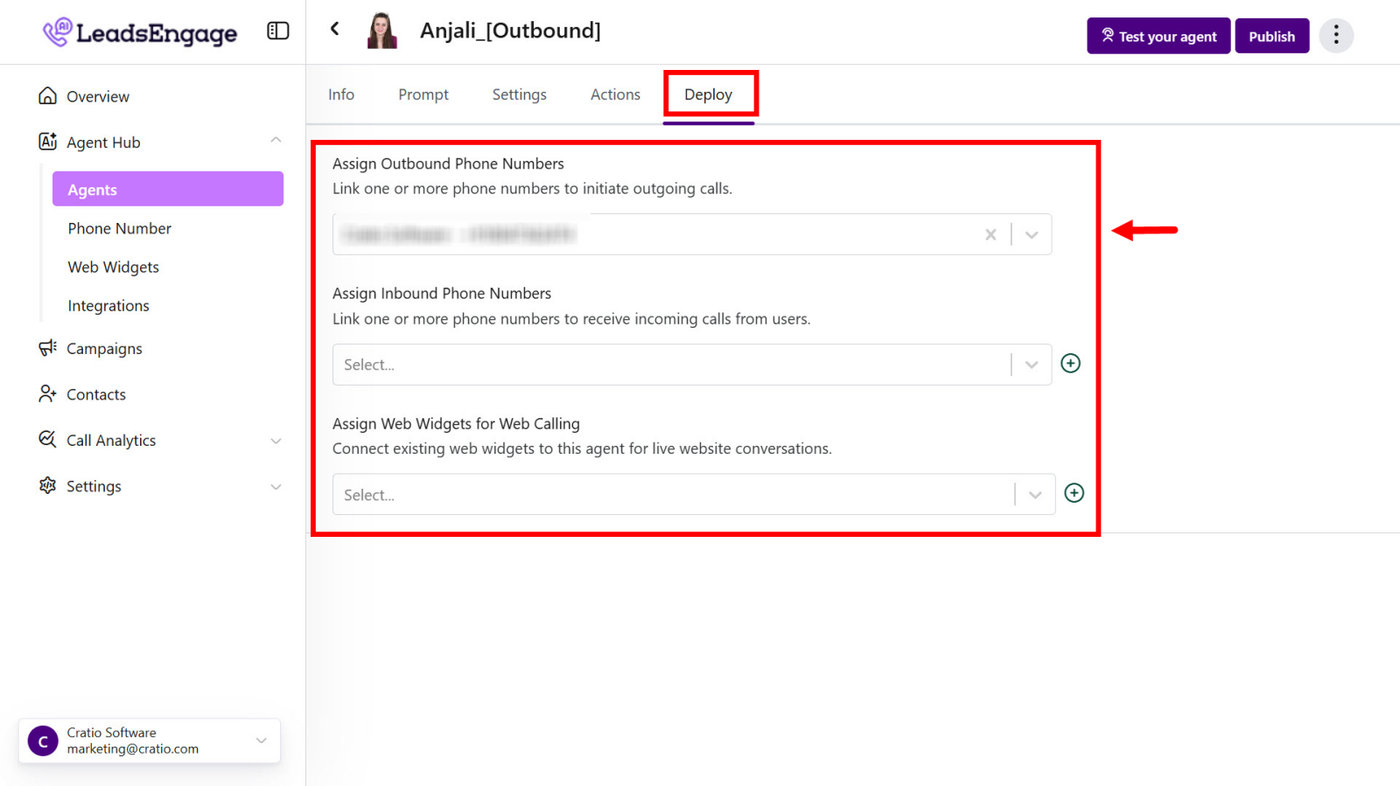 - Assign the number to your agent in the Deploy tab under agent settings.