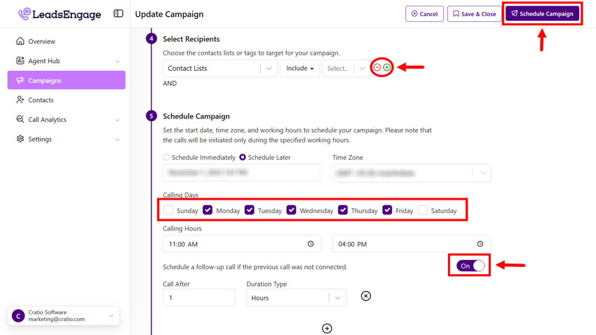 Auto Redial Rules for unanswered calls (e.g., retry after 15 mins, 4 hrs, next day)