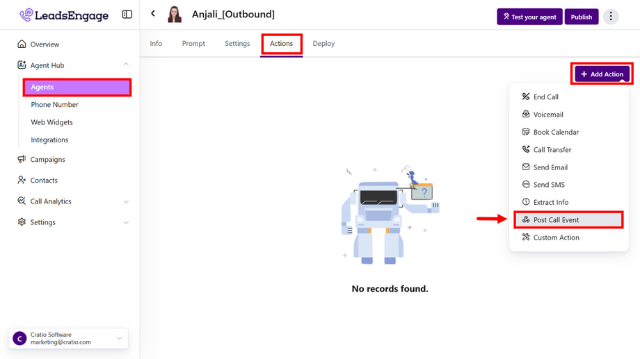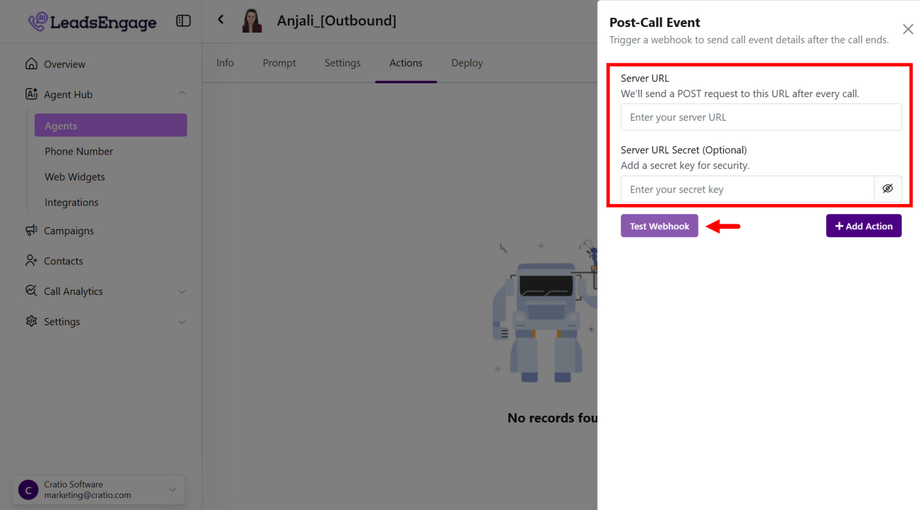 The Send Post Call Event action lets you automatically send call logs to your external tools, apps, or CRMs after every completed call. This helps centralize data and automate workflows without manual effort.